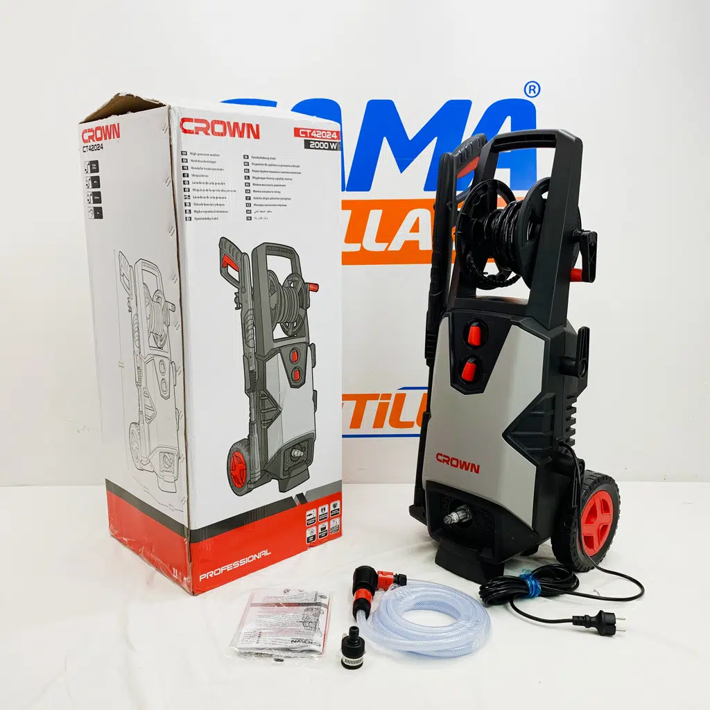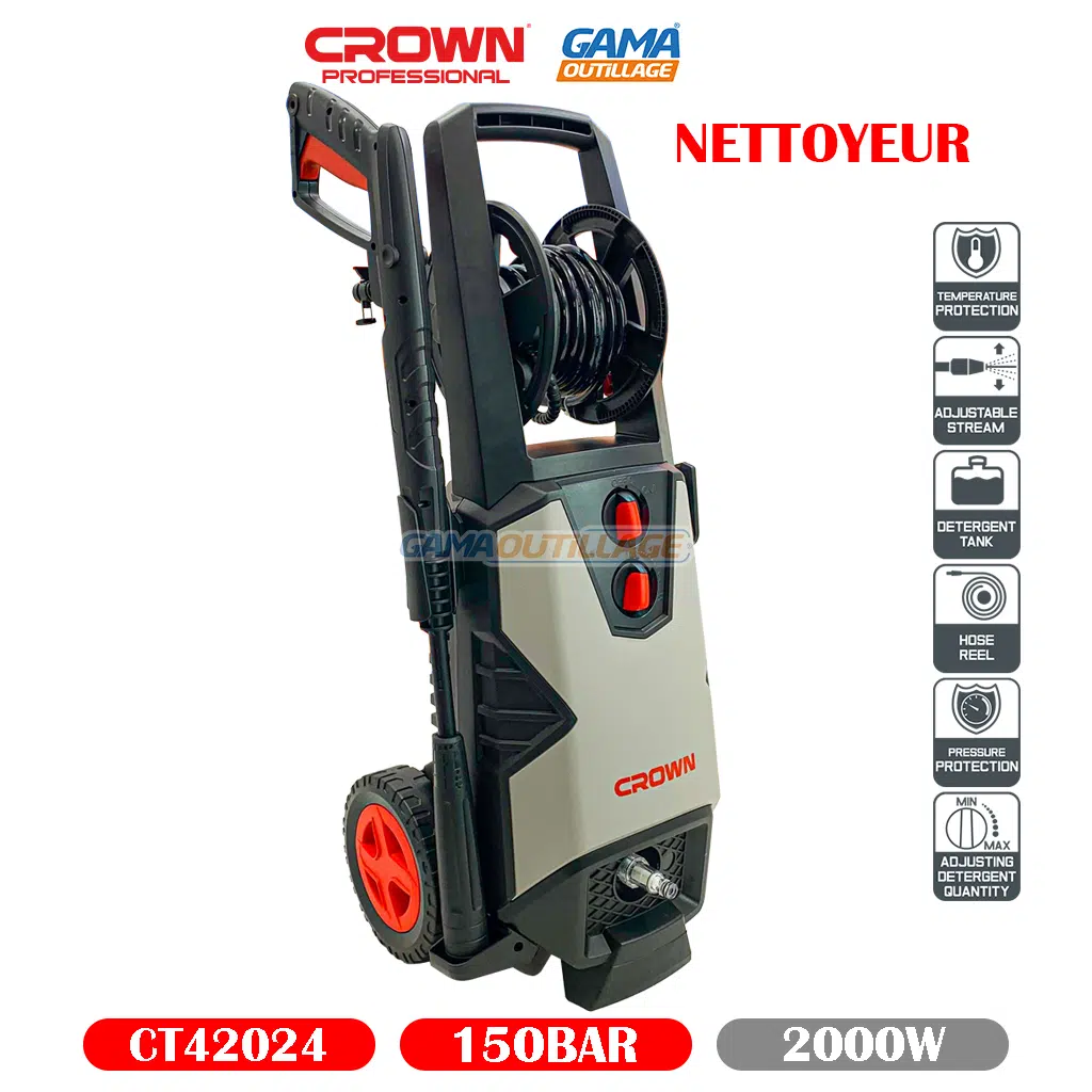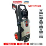 NETTOYEUR 150BAR 2000W CROWN, est un nettoyeur haute pression conçu pour un usage domestique et semi-professionnel. Il est doté d’un moteur puissant de 2000 W et d’une pression de 150 bars.
