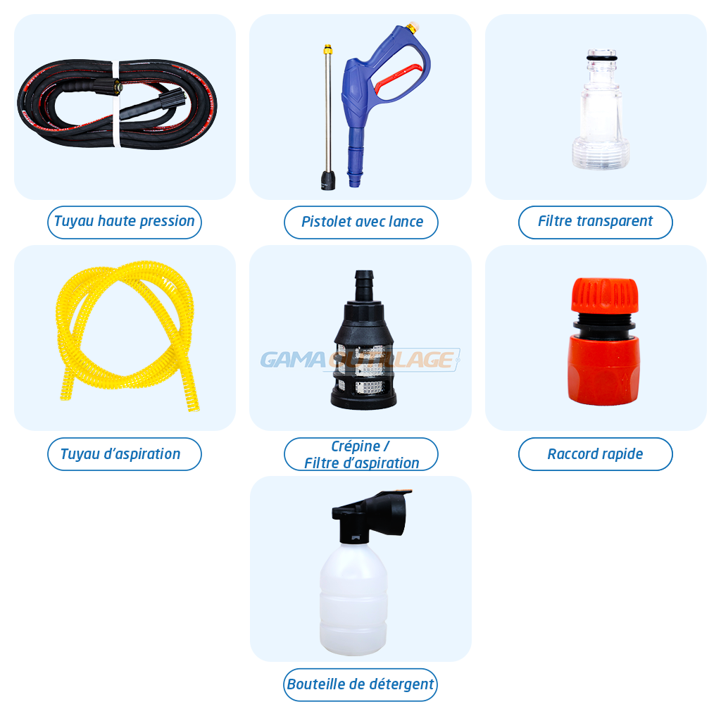 | Accessoires complets inclus dont un pistolet avec lance, un tuyau haute pression et un kit d’aspiration |