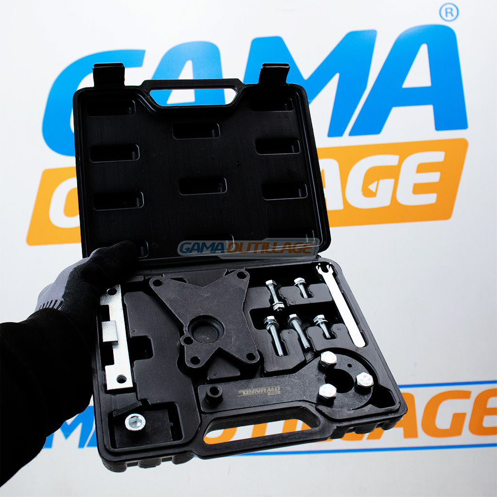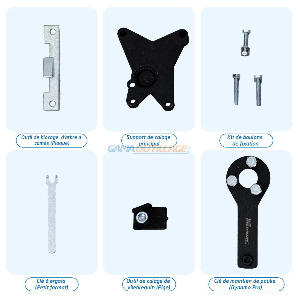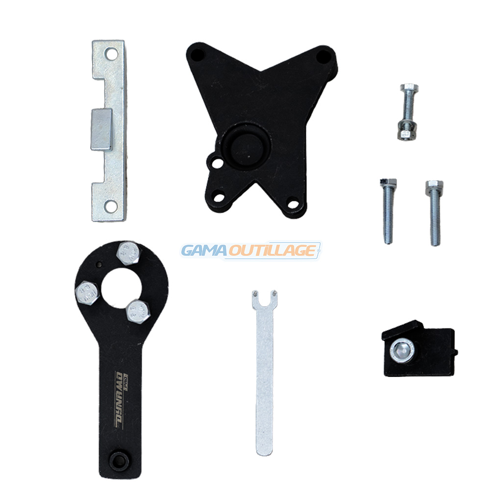 Composants inclus Plaque de blocage arbre à cames, pige de vilebrequin, support de calage, clé à ergots, clé de maintien de poulie