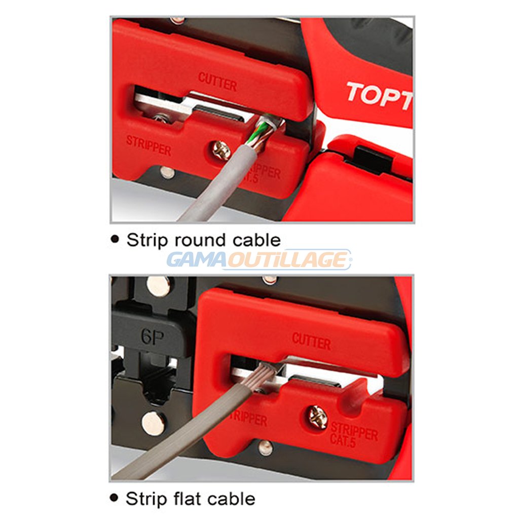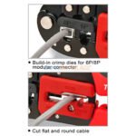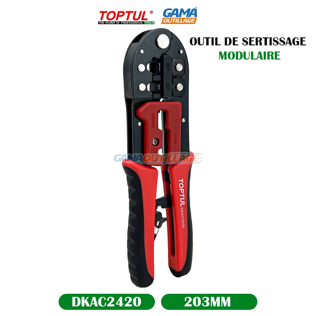 OUTIL DE SERTISSAGE MODULAIRE TOPTUL, est un outil polyvalent conçu pour sertir les connecteurs modulaires couramment utilisés dans les applications de réseau et de télécommunications.
