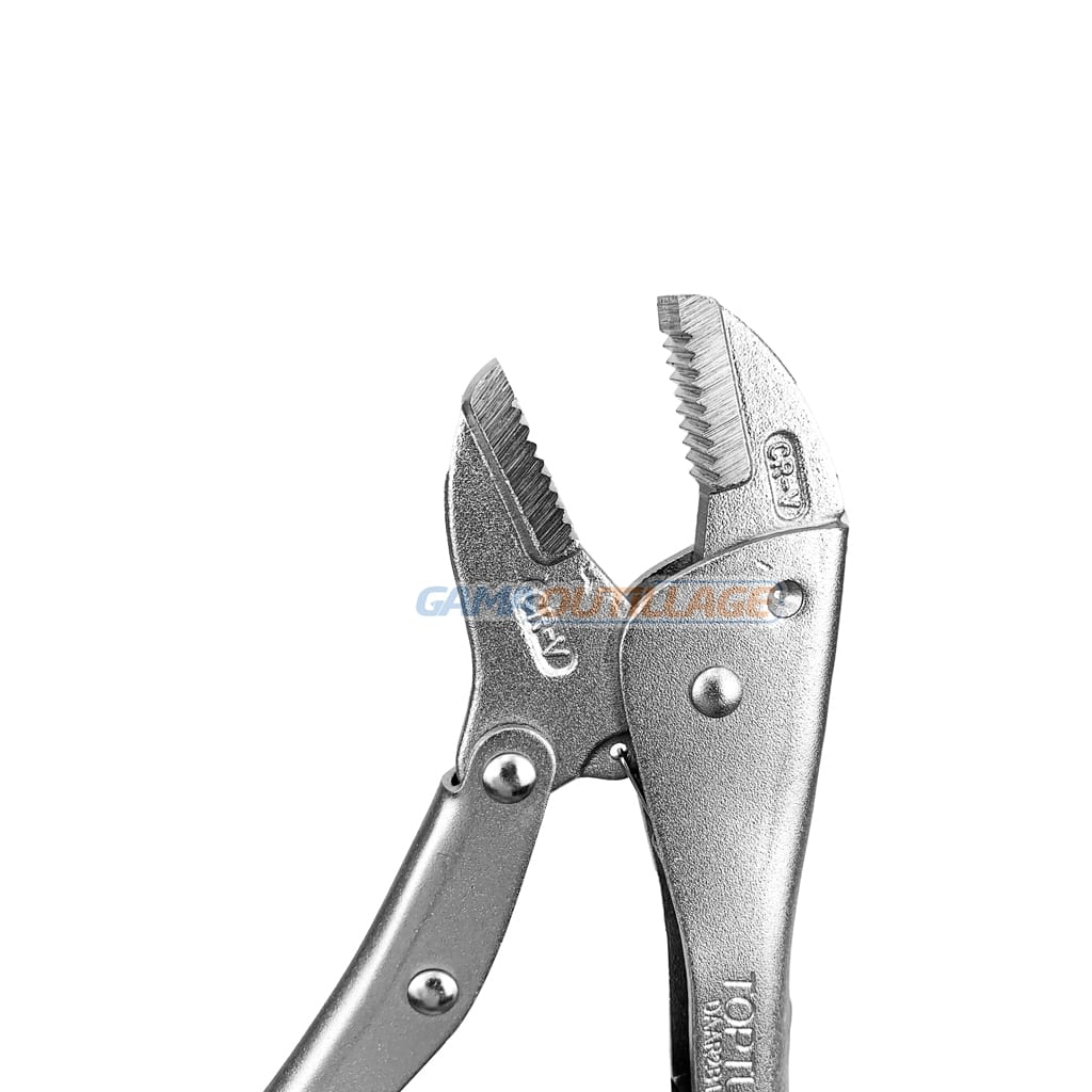 GAMAOUTILLAGE vous suggéré un PINCE ETEAU 10″ TOPTUL Pince de verrouillage de mâchoire incurvée tenue dans la main avec l’argent de coupe-fil 10 pouces, Pince-étau à mâchoire droite, La pince étau à mâchoire est utile pour serrer sans difficulté des éléments avec bordure. L’avantage principal de cet outil est sa capacité à maintenir le serrage grâce au système de blocage.