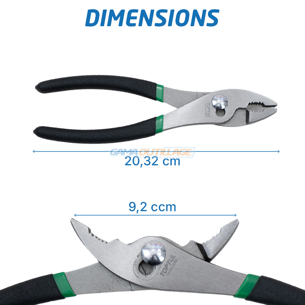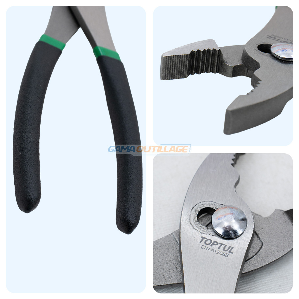Pince universelle 8″ TOPTUL DHAA1208 en acier chrome vanadium, avec réglage à 2 positions, mâchoires crantées et poignées antidérapantes.