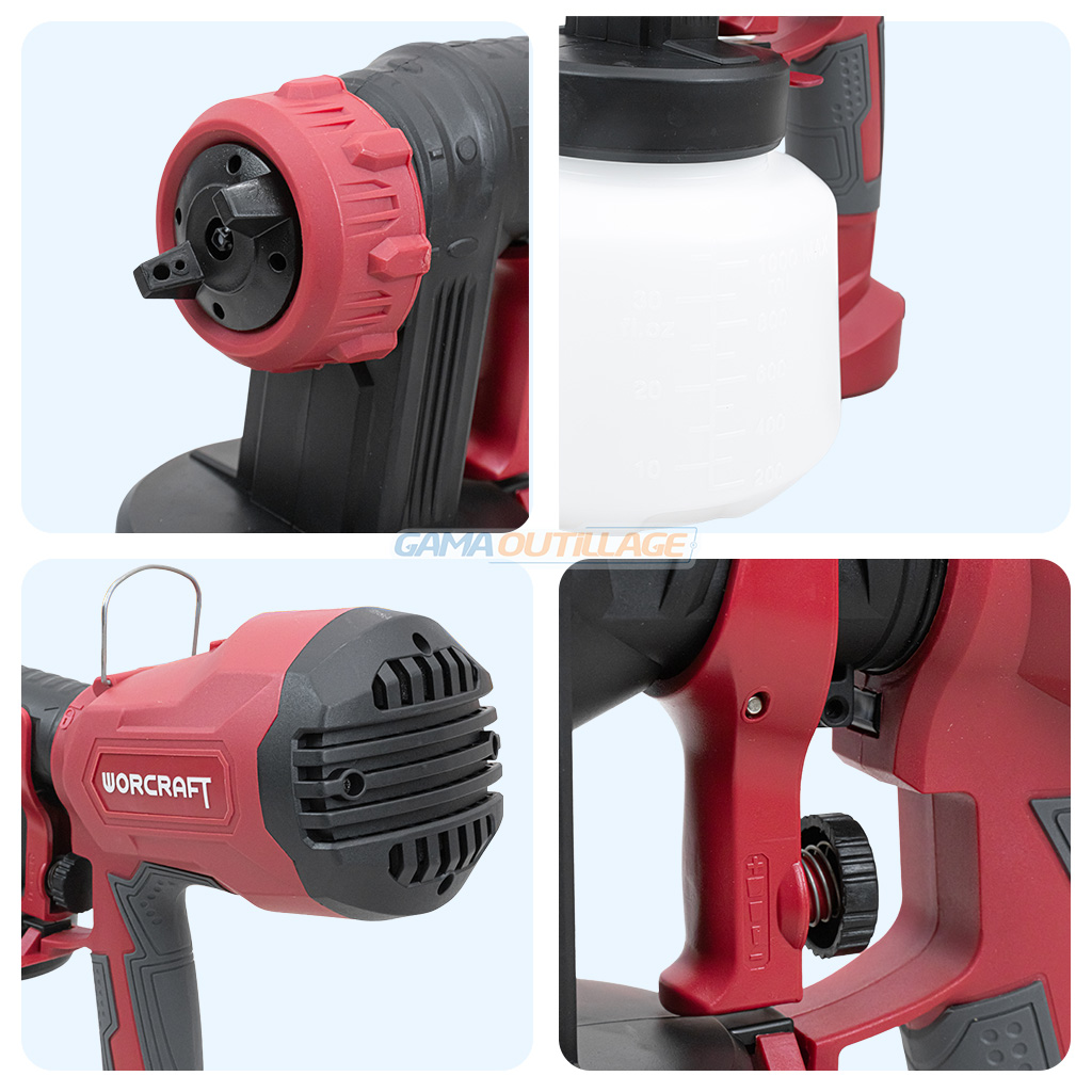 Le pistolet peinture électrique 400W WORCRAFT SG04-1000 est conçu pour réaliser des travaux de peinture propres et homogènes sur différentes surfaces.
