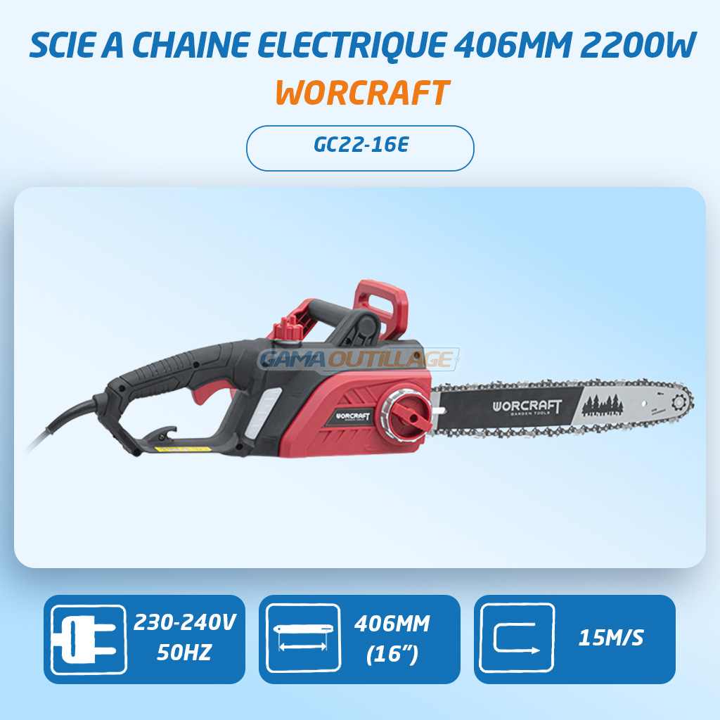 La scie à chaîne électrique 406mm 2200W WORCRAFT GC22-16E est une scie performante conçue pour la coupe du bois, l’entretien du jardin et les travaux domestiques.