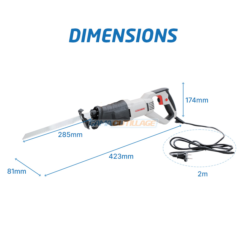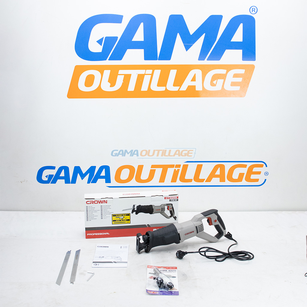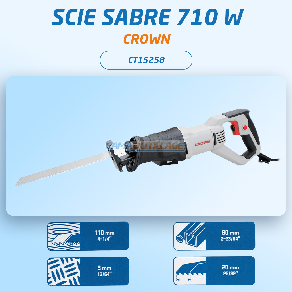 Scie sabre performante de 710W signée Crown, idéale pour les coupes précises dans le bois (110mm) et l’acier (5mm). Livrée avec deux lames et un chalumeau à gaz offert.