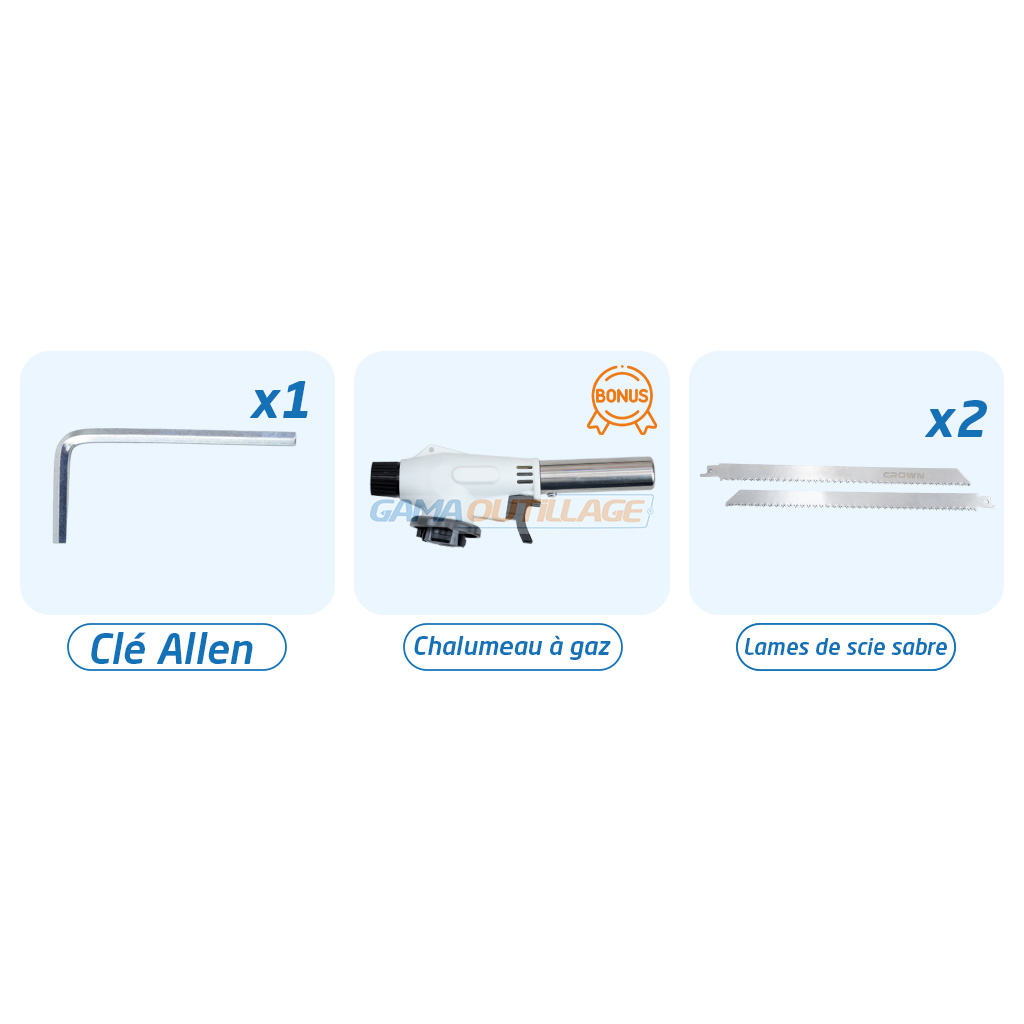 | Accessoires inclus | 1 Clé Allen, 1 Chalumeau à gaz (bonus), 2 Lames de scie |