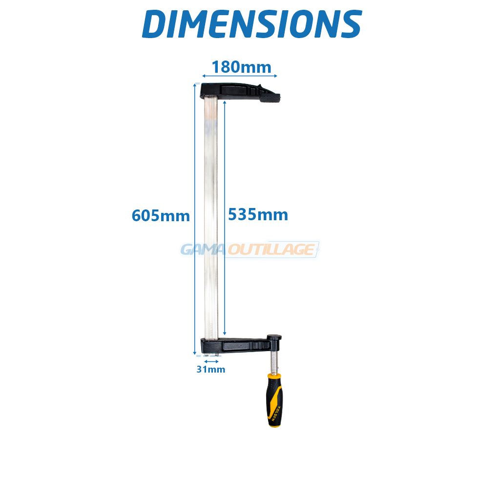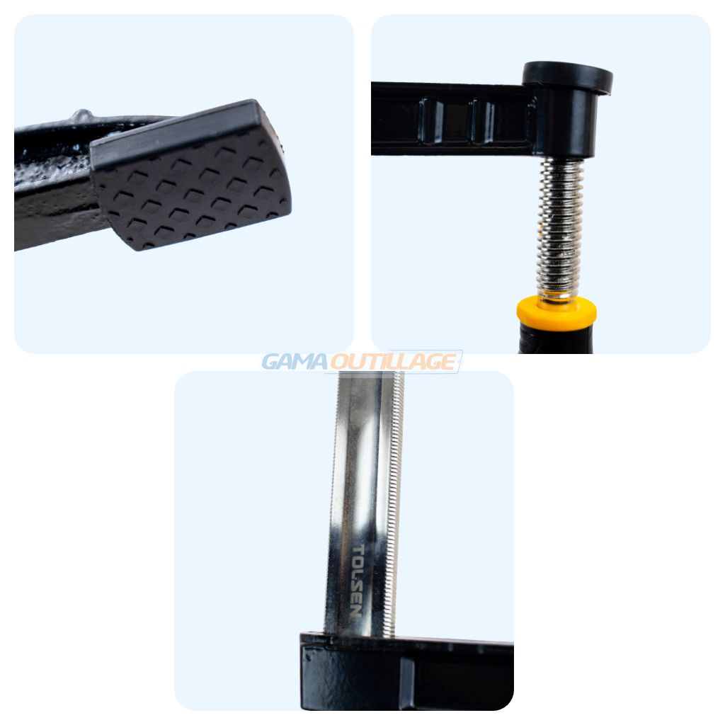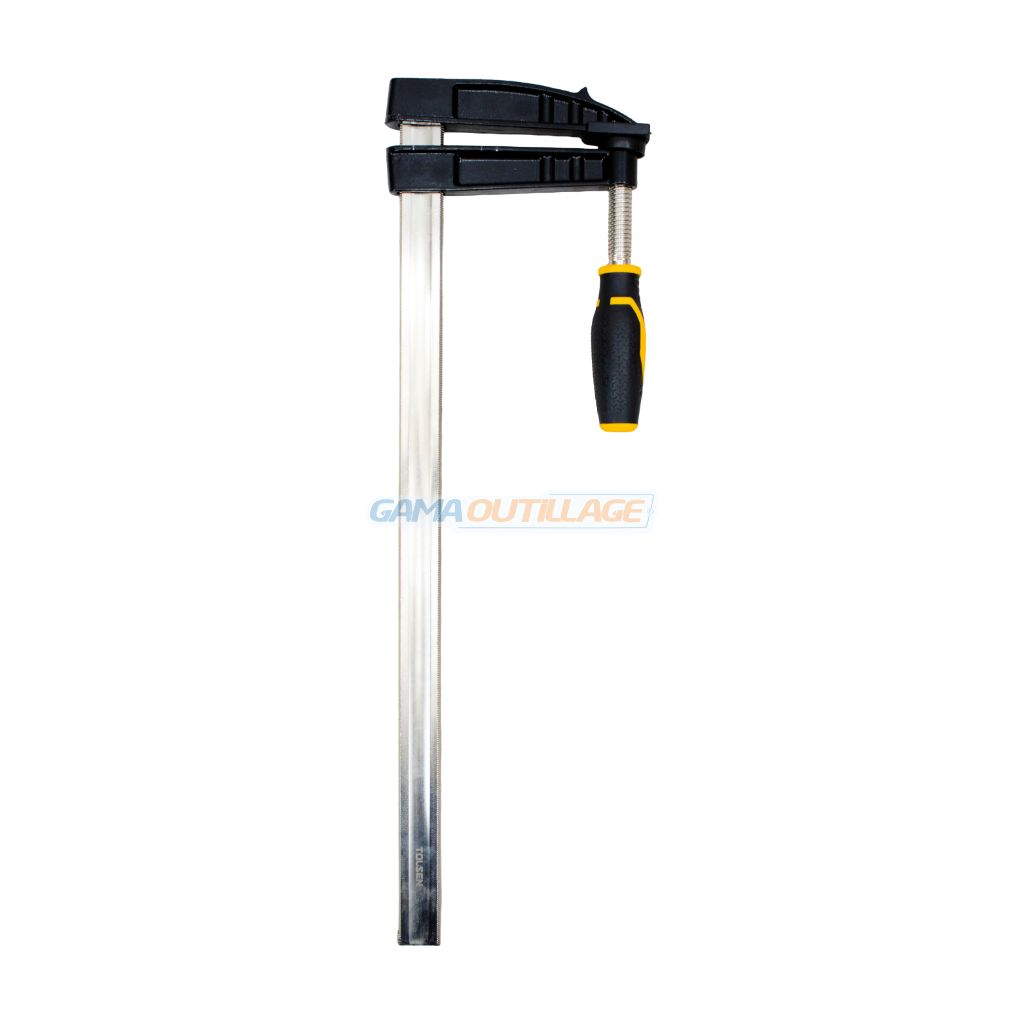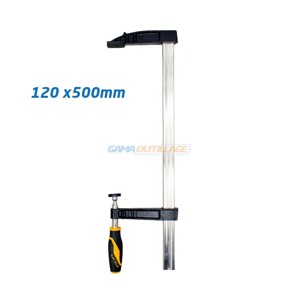 Serre-joint de type F Tolsen (Réf 10191) de qualité industrielle. Dimensions 120x500mm, barre nickelée et poignée bi-matière pour un serrage puissant et durable.