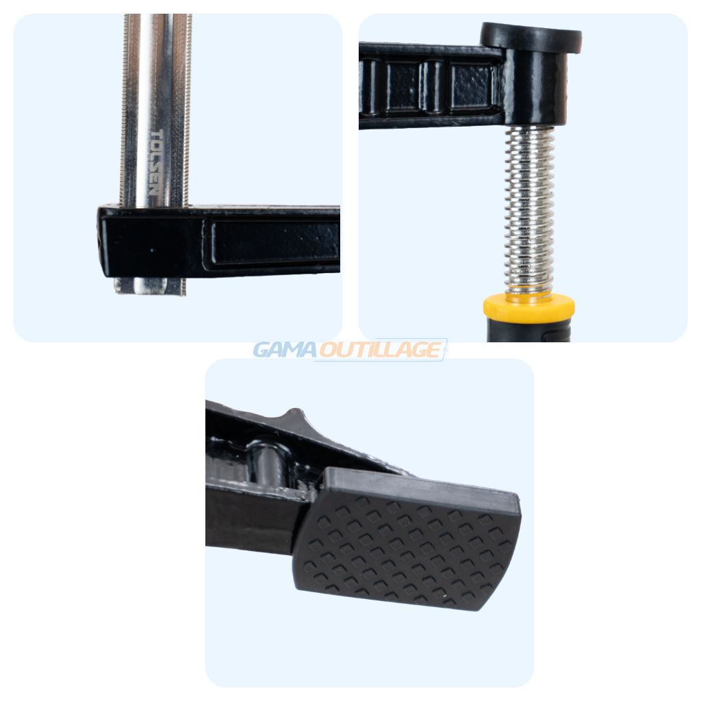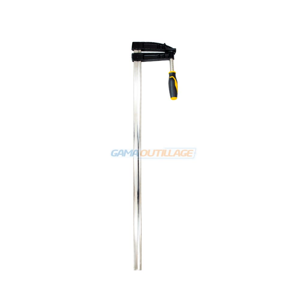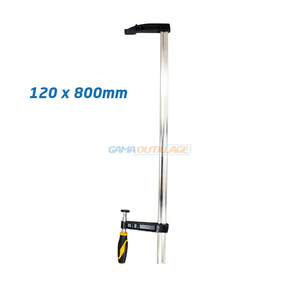 Le serre joint métallique Tolsen 120x800mm référence 10193 est un outil de serrage de la gamme Industrial, conçu pour les professionnels exigeants en menuiserie et en construction. Ce modèle de type F-Clamp offre une capacité de serrage importante de 800 mm avec une profondeur de saillie de 120 mm, permettant le maintien ferme de pièces larges et épaisses. Sa structure robuste allie une barre en acier plaqué nickel pour la résistance à la corrosion et une tige filetée à finition noire pour un glissement fluide et puissant.