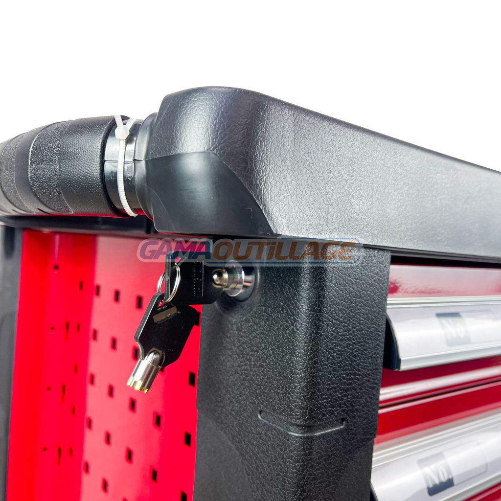 - VERROUILLABLE ET ERGONOMIQUE : Des poignées ergonomiques facilitent la poussée et la traction du chariot à outils. Un système de fermeture central permet de verrouiller la servante et de la protéger contre tout accès non autorisé. Deux clés sont incluses dans la livraison.