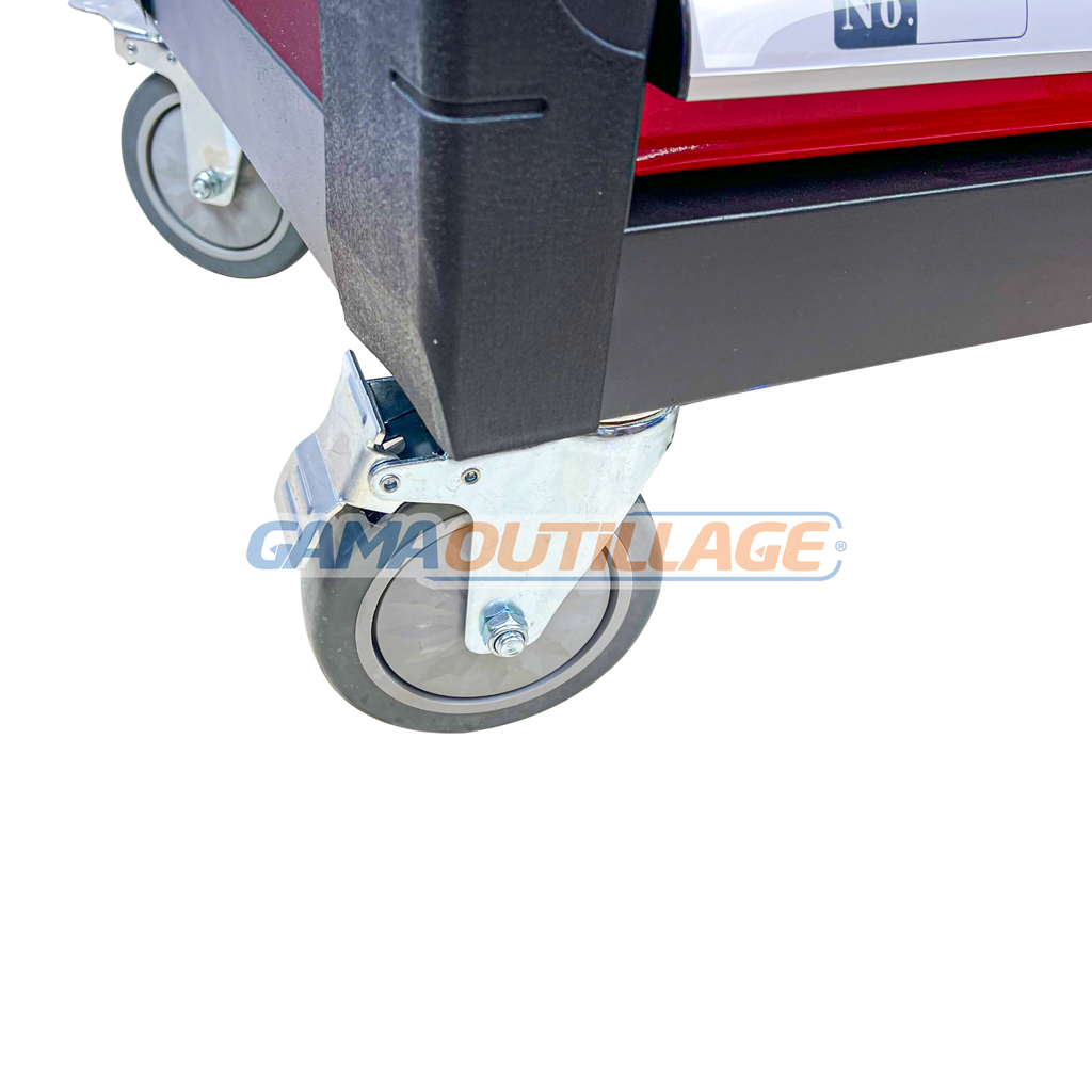 - ROUES DIRECTRICES: Les roues de la servante d’atelier sont stables et faciles à manœuvrer. Deux roues pivotantes facilitent la manœuvre et les freins de stationnement assurent la stabilité lorsque le chariot doit être rangé sur place.