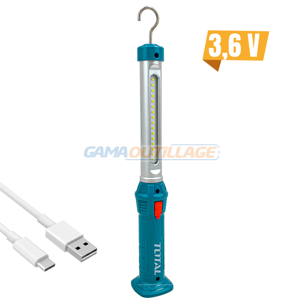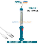 GAMAOUTILLAGE vous propose une TORCHE DE TRAVAIL TOTAL, la lampe a une luminosité élevée, ne scintille pas lorsqu’elle est utilisée en continu pendant 3 heures sous une lumière vive ou 7 heures sous une faible luminosité. Temps de charge rapide, sous réserve d’un entretien approprié. Un câble USB est inclus pour charger la batterie.