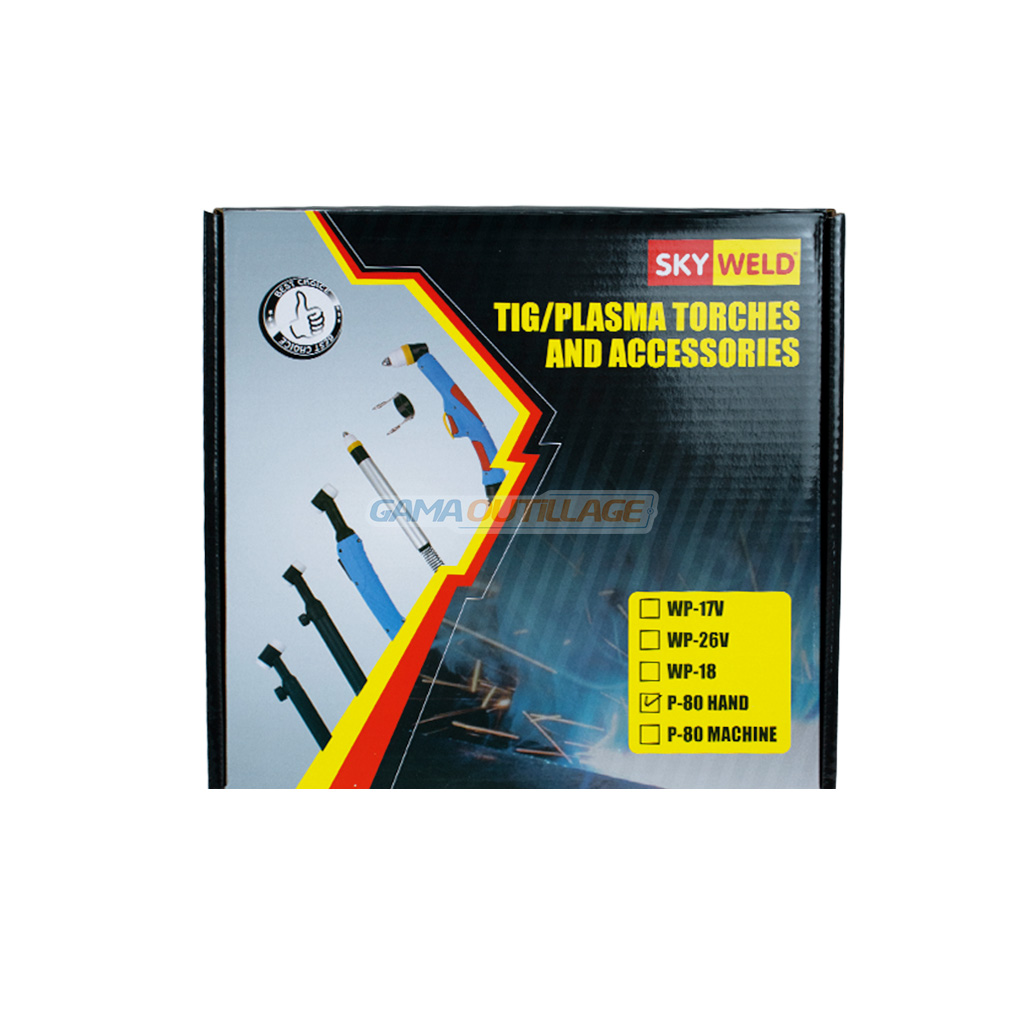 TORCHE PLASMA MANUELLE 05M SKY WELD P-80 HANDDescription GénéraleLa torche plasma manuelle 05M SKY WELD P-80 HAND est conçue pour les travaux de découpe plasma précis et intensifs. Dotée d’un câble de 5 mètres, elle offre une excellente liberté de mouvement et une manipulation confortable. Son design ergonomique avec poignée antidérapante assure une prise en main sécurisée, même lors des utilisations prolongées. Compatible avec les postes plasma équipés du système P-80, cette torche est livrée avec ses accessoires visibles : connectique, clé de serrage et guide de coupe. Caractéristiques Techniques