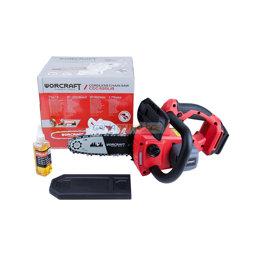Tronçonneuse à chaîne 20V WORCRAFT CGC-S20LIB, guide 8” (203mm), capacité 175mm, moteur brushless. Version solo sans batterie ni chargeur.