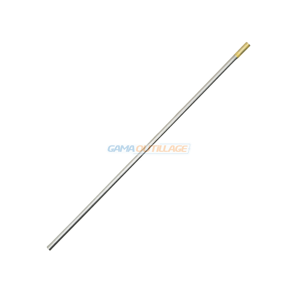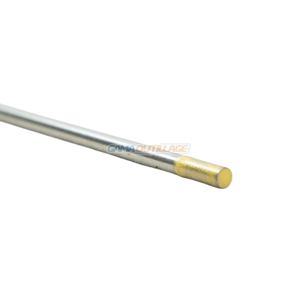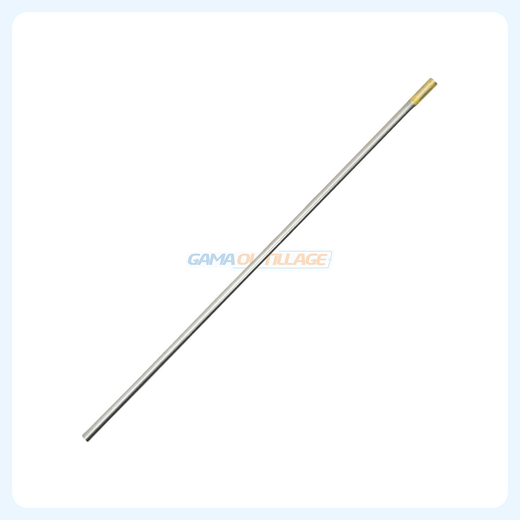 Elle se présente sous forme d’une tige droite en tungstène, avec une extrémité repérée par une coloration dorée, facilitant son identification visuelle.