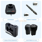 Kit complet : livré avec 2 batteries, chargeur, embout et mallette robuste.
