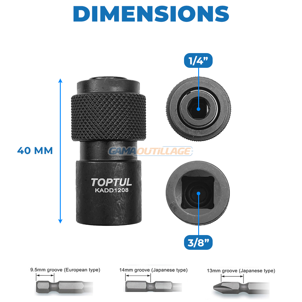 Adaptateur clé à choc TOPTUL KADD1208 (3/8″ vers 1/4″), en Cr-V trempé, avec mandrin à dégagement rapide. Convertit votre clé à choc en un outil polyvalent.