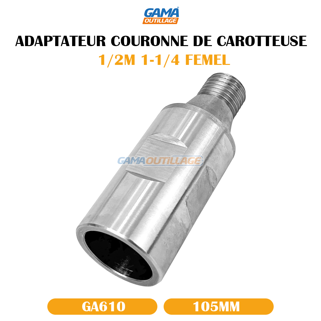 GAMAOUTILLAGE vous propose une ADAPTATEUR COURONNE DE CAROTTEUSE 1-1/4 MAL 1/2 FEMELLE, est un accessoire essentiel pour les professionnels du forage. Il permet d’adapter des couronnes de carottage avec un filetage 1/2 mâle sur des carotteuses équipées d’un filetage 1-1/4 femelle.