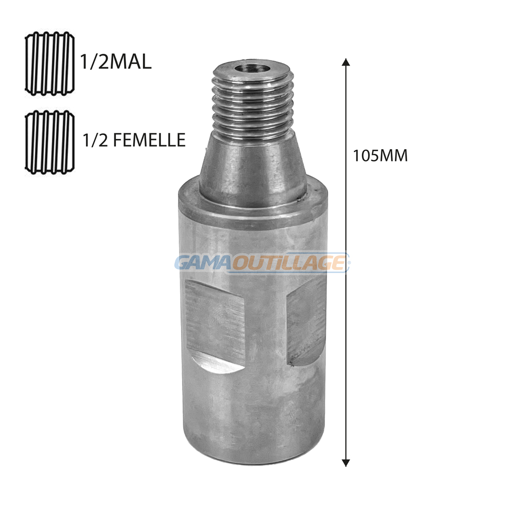 ADAPTATEUR COURONNE DE CAROTTEUSE 1-1/4 MAL 1/2 FEMELLE, est un accessoire essentiel pour les professionnels du forage. Il permet d’adapter des couronnes de carottage avec un filetage 1/2 mâle sur des carotteuses équipées d’un filetage 1-1/4 femelle.