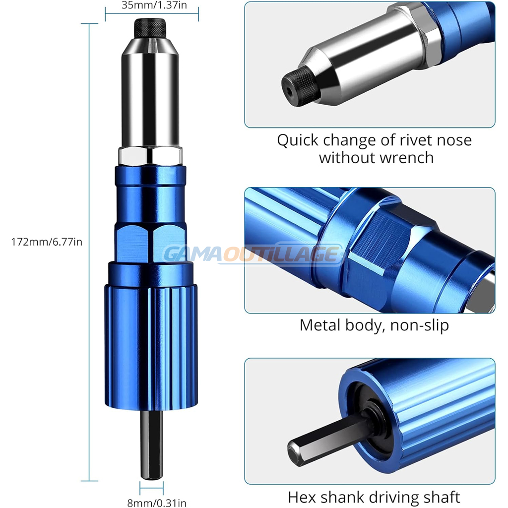 - Matériau de qualité supérieure : cet adaptateur de rivet électrique est entièrement en métal forgé et a une grande force de travail, tête forgée en acier allié, robuste et pratique, peut atteindre rapidement des rivets.
