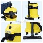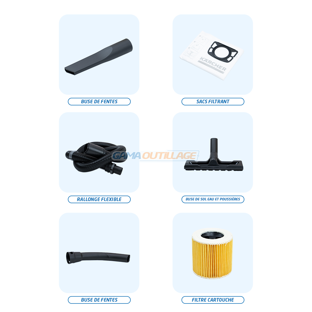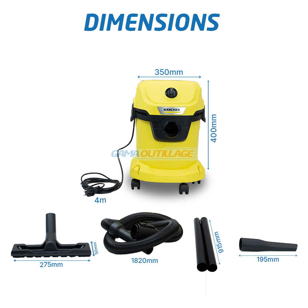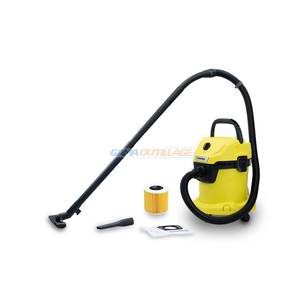 Aspirateur WD3 15L 1000W Karcher, idéal pour eau et poussières. Cuve robuste, grande puissance et accessoires complets.