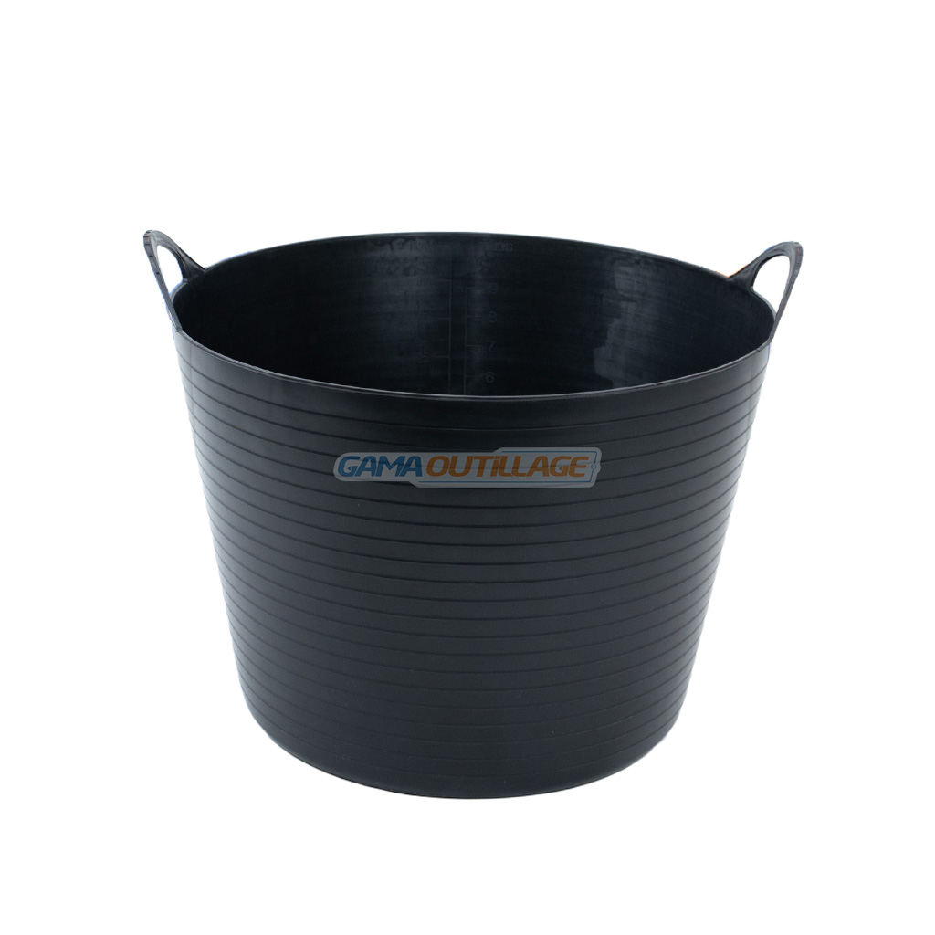 Auge plastique noire 42 L avec poignées renforcées, fabrication locale, idéale pour transporter ou mélanger matériaux sur chantier ou en bricolage.
