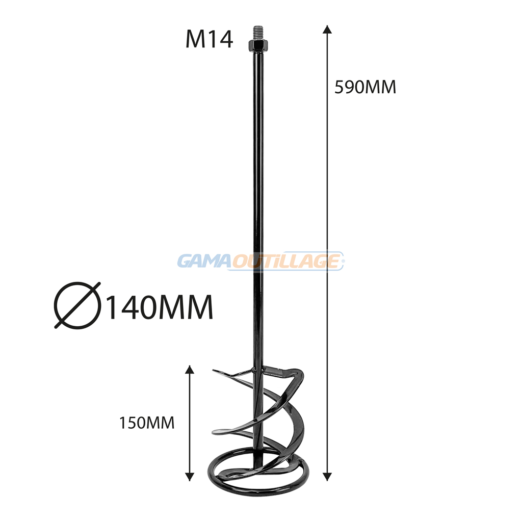 - Dimensions : 140 mm de diamètre pour la pale de mélange, et 590 mm de longueur pour la tige. Ces dimensions sont importantes pour déterminer la quantité et la consistance des matériaux que la tige peut mélanger efficacement.