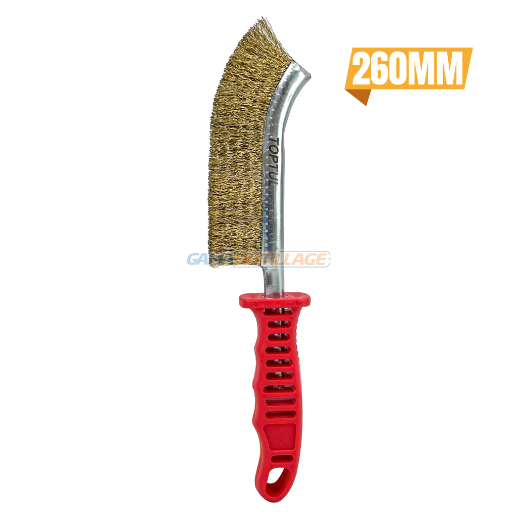 BROSSE METALIQUE CUIVREE TOPTUL, est un outil manuel utilisé pour nettoyer et préparer des surfaces en enlevant la rouille, la peinture écaillée, la saleté tenace et d’autres contaminants.
