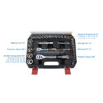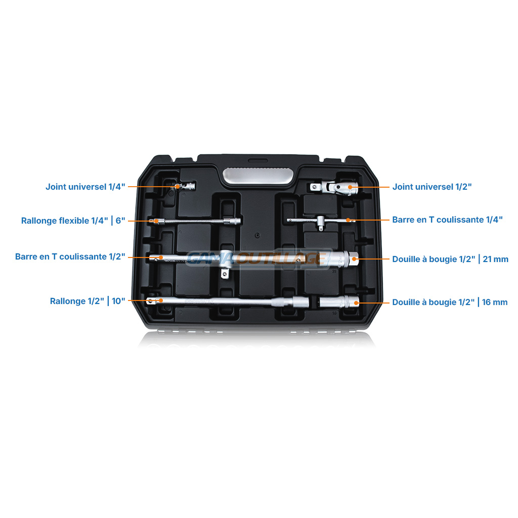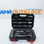 Elle contient douilles hexagonales 1/2″ et 1/4″, cliquets, rallonges, joints universels, barres en T, et douilles à bougie, parfaitement organisés dans une mallette robuste.