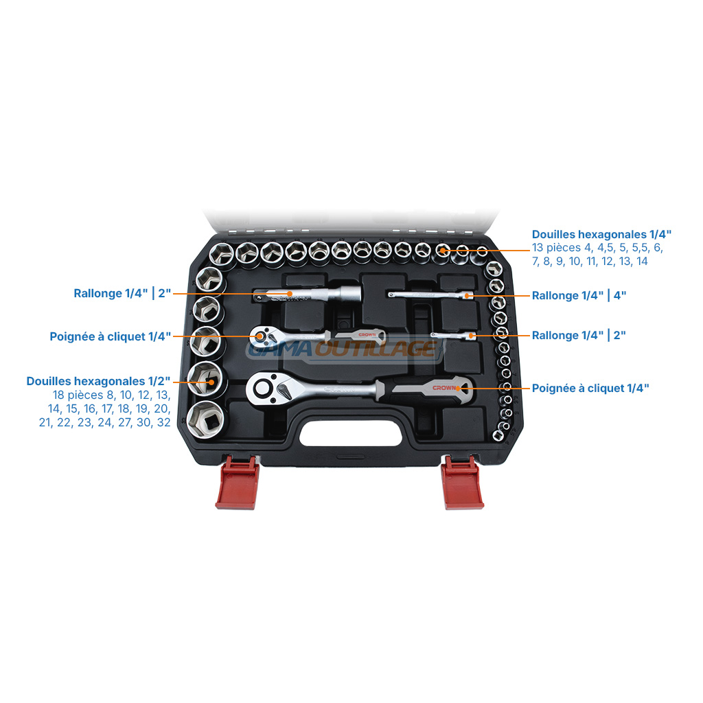 CAISSE A DOUILLE 1/2″ 1/4″ 44PCS CROWN