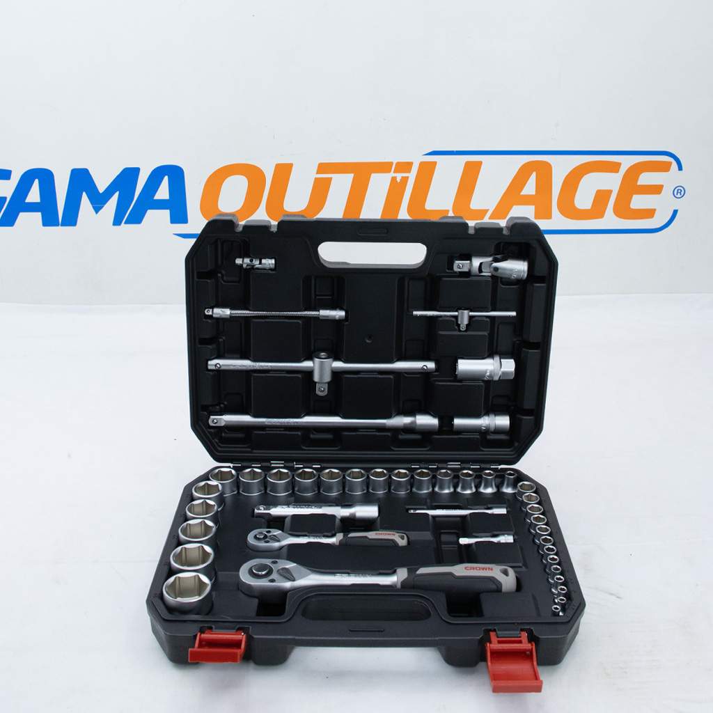 Caisse à douille 44PCS Crown comprenant douilles 1/2″ et 1/4″, cliquets, rallonges et accessoires essentiels. Mallette robuste idéale pour mécanique & bricolage.