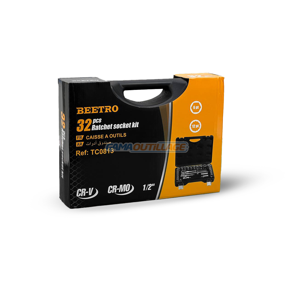 Kit complet de 32 douilles à cliquet BEETRO, incluant accessoires et étui. Parfait pour les professionnels. Réf. TC0813.