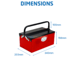 Elle est équipée d’une poignée métallique centrale et de deux loquets latéraux qui assurent une ouverture fluide et un accès rapide à vos outils. Ses dimensions de 340 x 203 x 156 mm lui confèrent un bon volume sans encombrement.