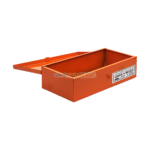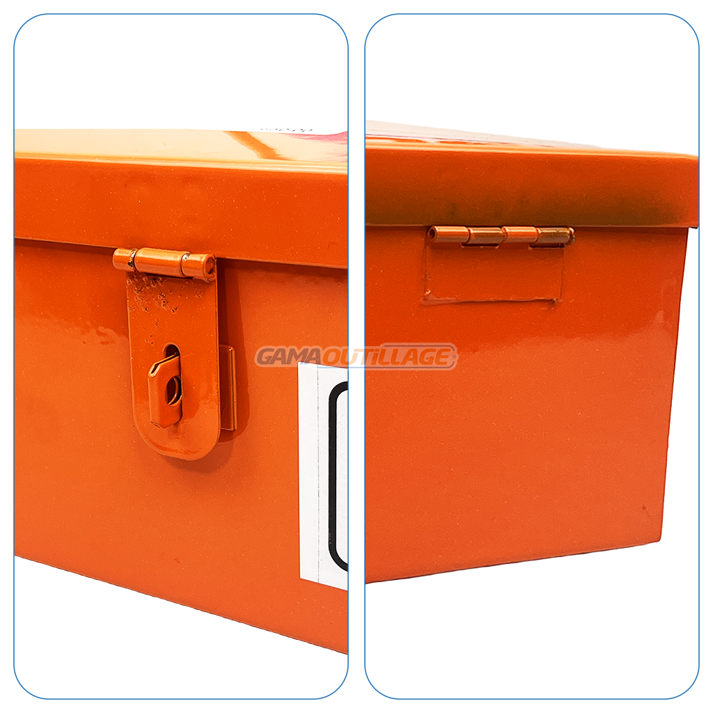 Son couvercle articulé avec système de fermeture à loquet permet une ouverture rapide et un transport sécurisé. Elle est équipée d’une poignée métallique soudée pour une bonne prise en main, même avec des gants. Une étiquette extérieure indique clairement son usage, ce qui en fait une boîte pratique aussi bien pour les professionnels que pour les bricoleurs.