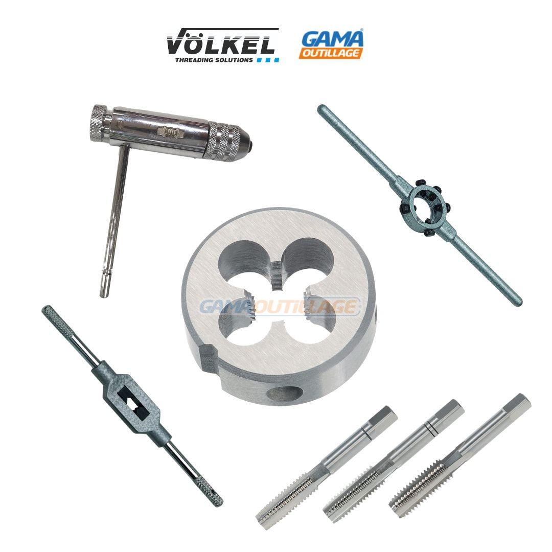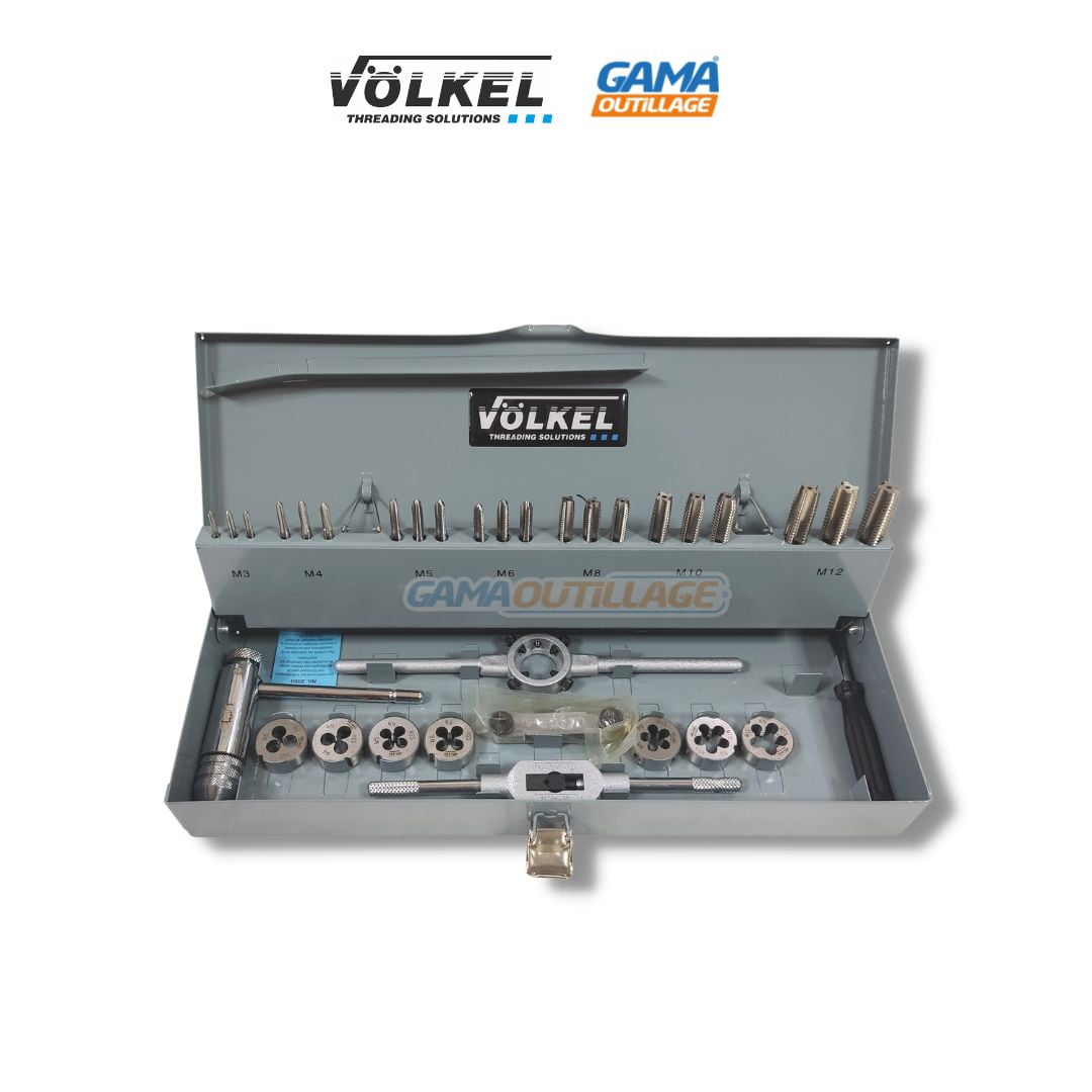 La CAISSE TARAUD ET FILIERE M3-12 marque VOLKEL, est un jeu de 31 pièces, de tarauds et remplisseurs à main et filières rondes du M 3 à M 12.