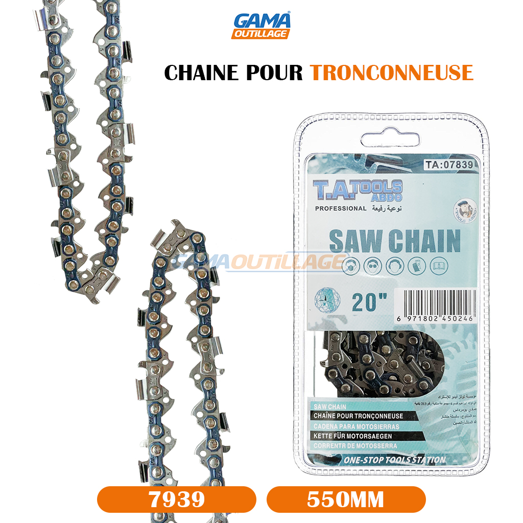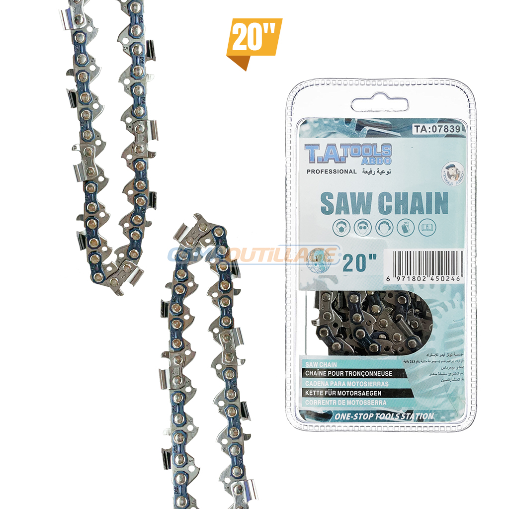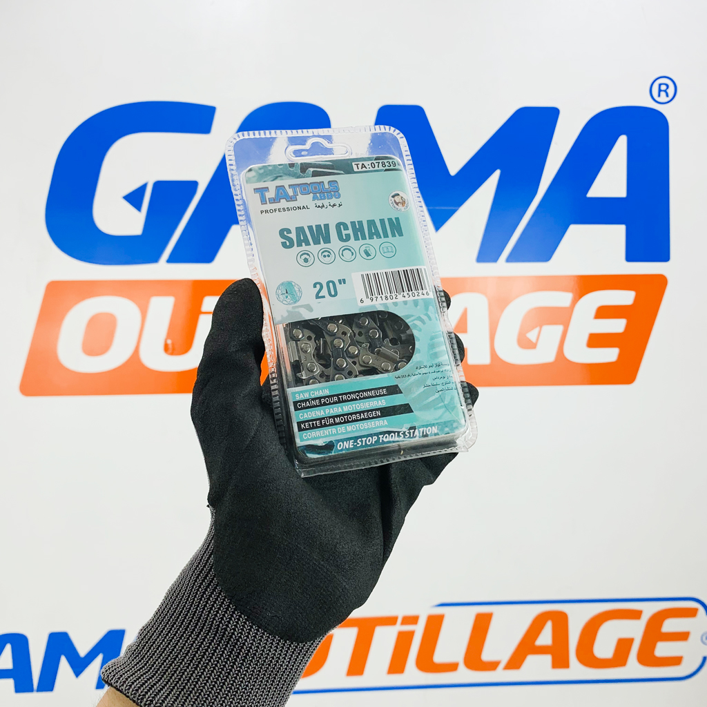 GAMAOUTILLAGE vous propose une CHAINE POUR TRONCONNEUSE 20″ TA, est un élément essentiel pour l’entretien de votre jardin. Elle s’adapte à la plupart des tronçonneuses de taille standard et est idéale pour une multitude de tâches, de l’élagage à l’abattage de petits arbres.