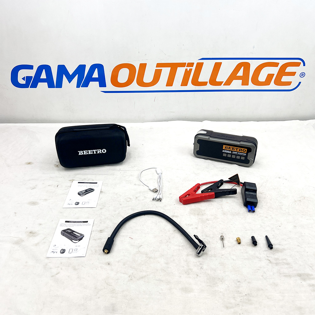 Booster batterie BEETRO 24000mAh 4000A avec gonfleur intégré. Démarreur 12V, lampe LED, ports USB et accessoires inclus.