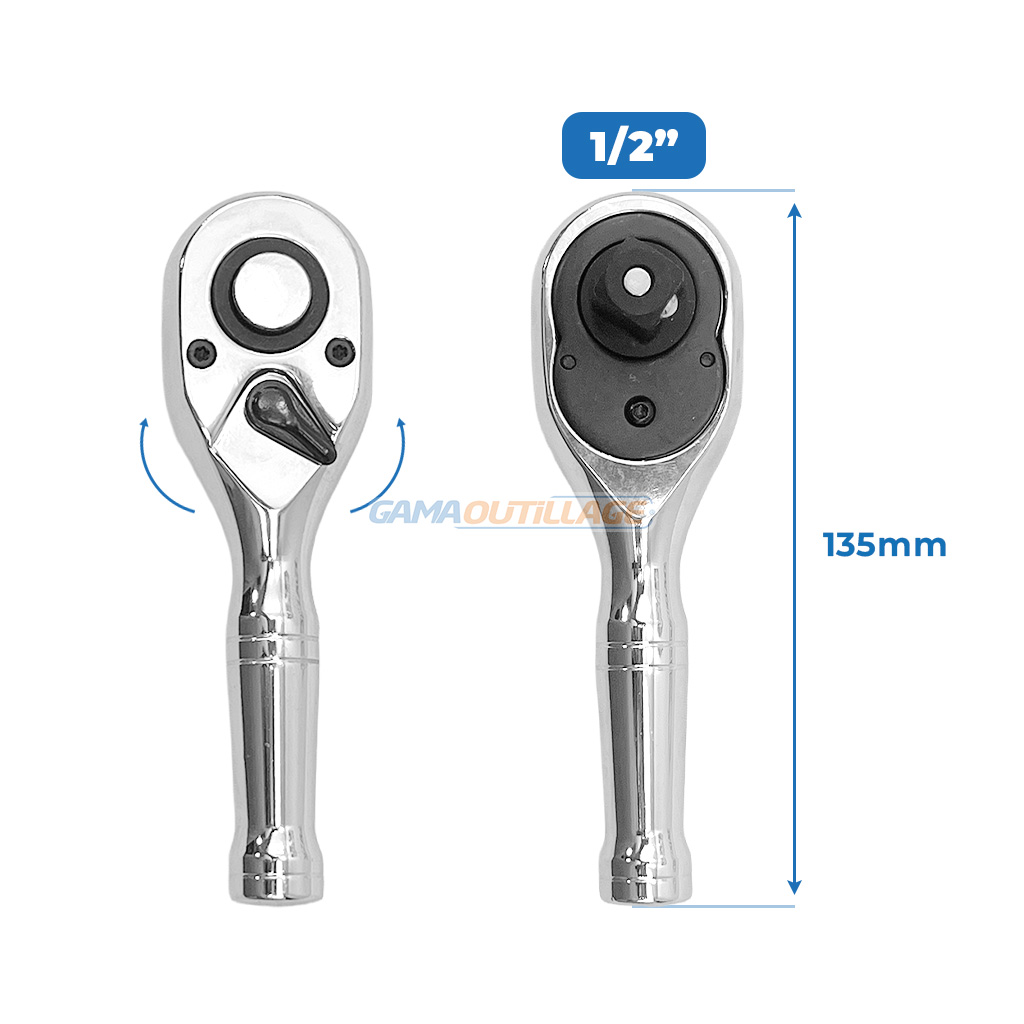 Cliquet réversible DNM 1/2″ court (135 mm). Compact, robuste et pratique, parfait pour les zones étroites et les serrages efficaces. Disponible chez GAMA OUTILLAGE.