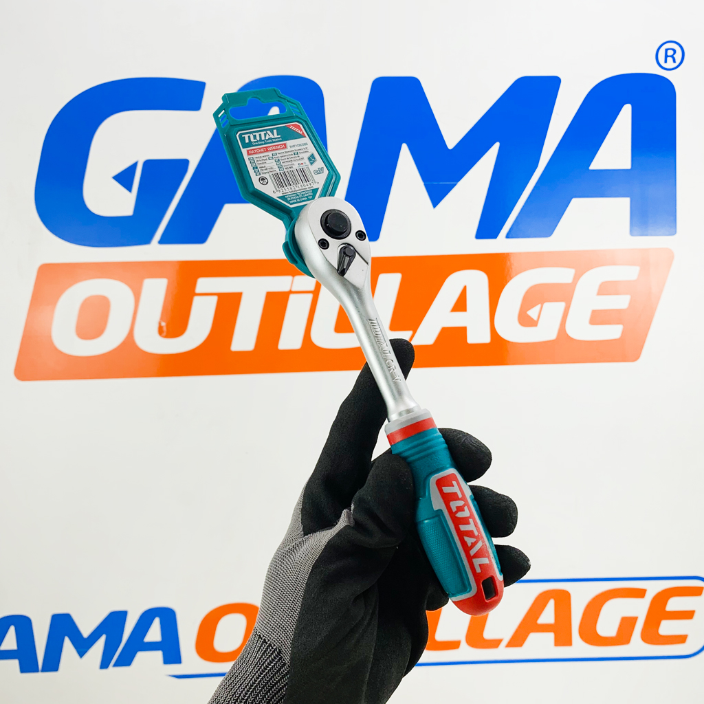 GAMAOUTILLAGE vous propose une CLIQUET REVERSIBLE 3/8″ TOTAL, Poignée à cliquet réversible avec dégagement rapide, Le cliquet 3/8″ Poignée Plastique Total est un outil de qualité professionnelle qui est parfait pour les travaux de bricolage et de réparation. Il est fabriqué en acier Chrome vanadium, ce qui lui confère une grande robustesse. Le cliquet est également équipé d’un mécanisme de cliquet qui permet de serrer et de desserrer rapidement les vis.