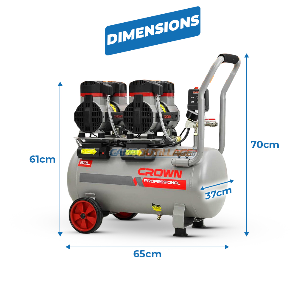Le compresseur silencieux CROWN CT36107 est l’outil idéal pour vos travaux d’air comprimé en environnement domestique, professionnel ou artisanal. Doté d’un moteur de 1160 W, ce modèle fonctionne sous une tension de 220-230 V et offre une capacité de 50 litres, permettant une utilisation prolongée sans perte de pression.