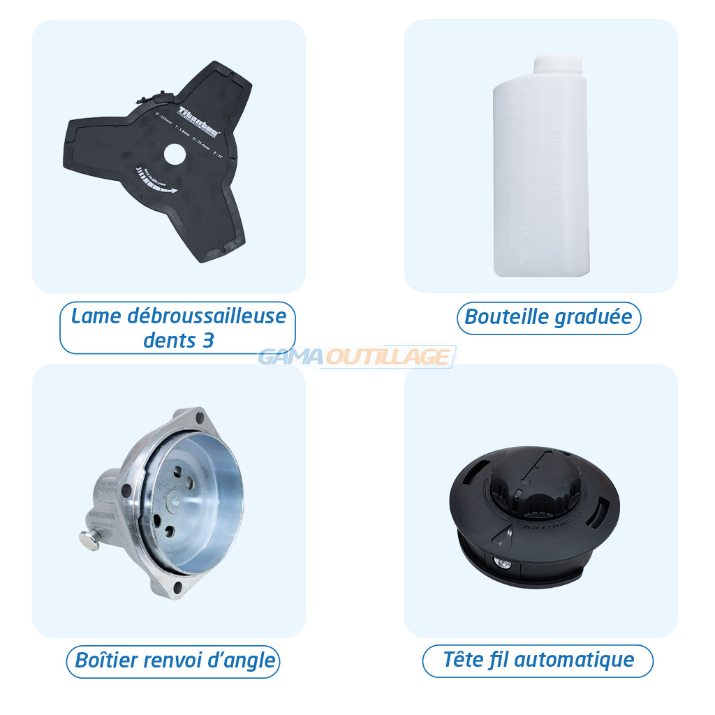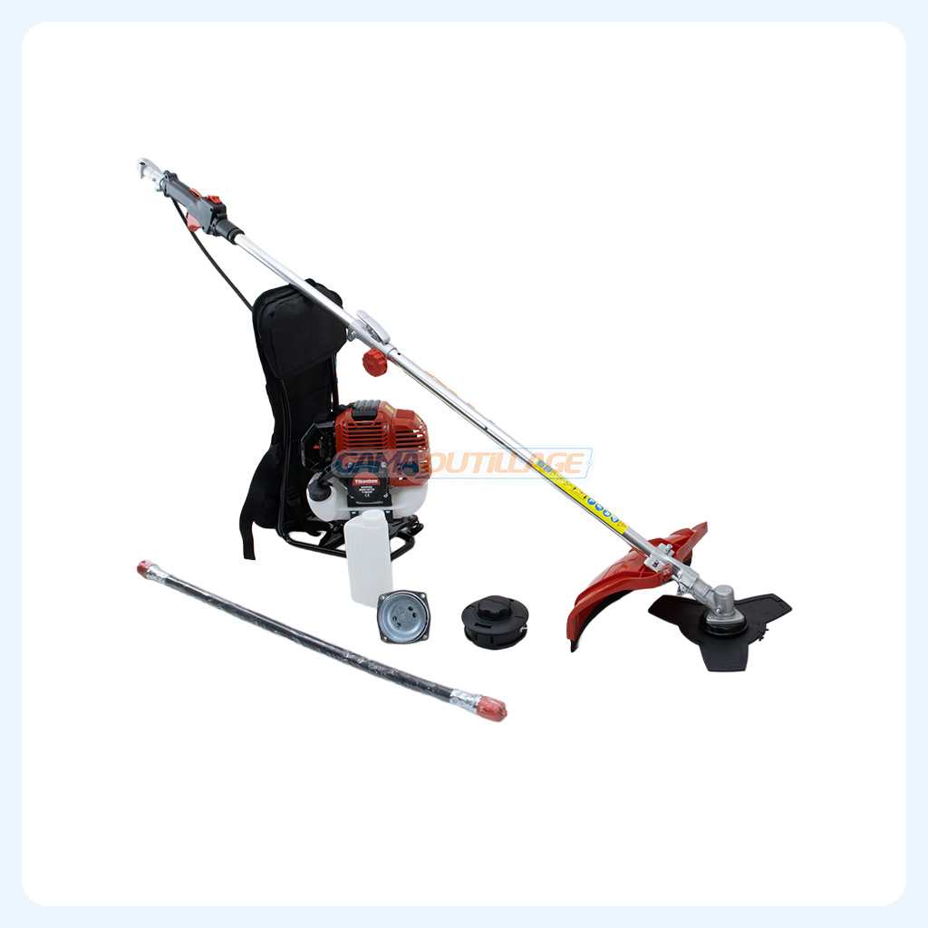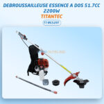 Débroussailleuse essence à dos 51.7CC – 2200W TITANTEC, livrée avec lame 3 dents, tête fil automatique, renvoi d’angle, harnais dorsal et accessoires.