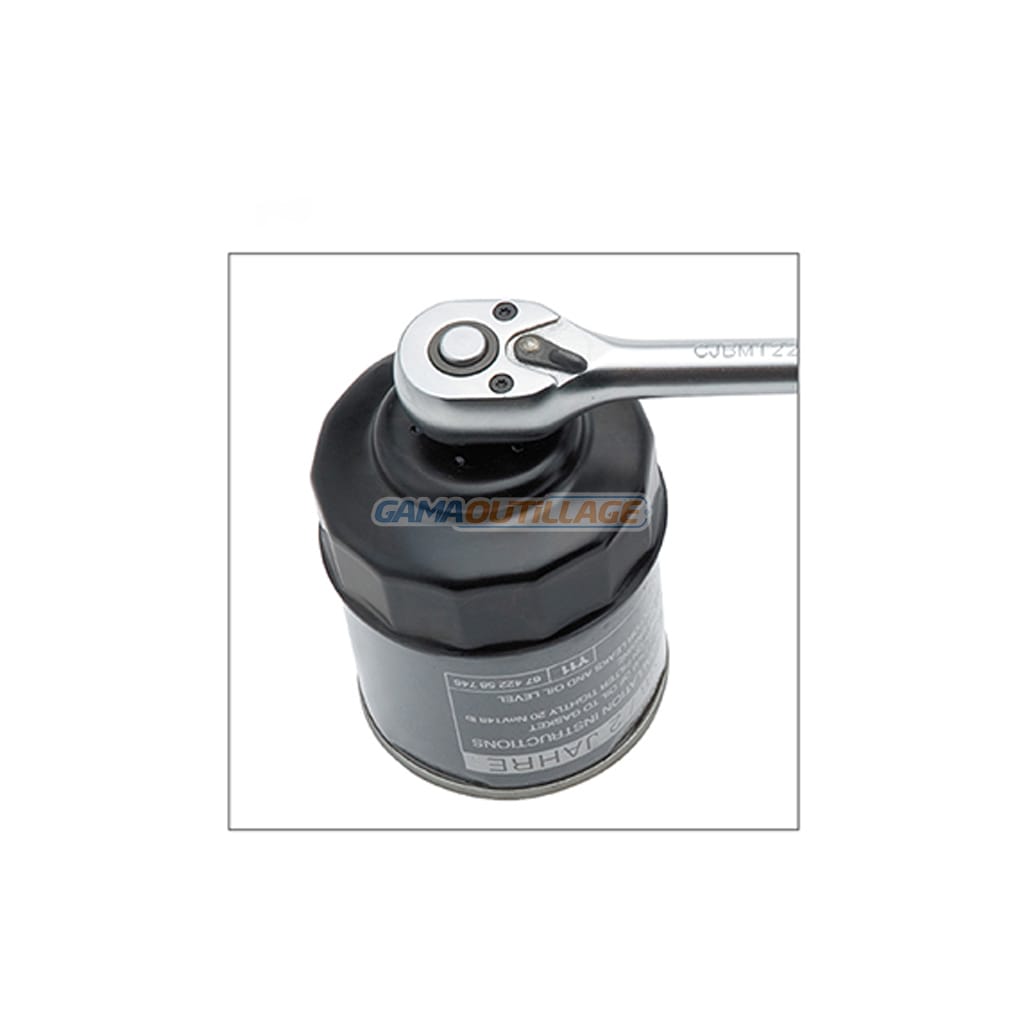 - Pour utiliser la clé de filtre à huile de type coupelle, vous devez généralement la fixer sur une clé à cliquet ou une barre de rallonge pour obtenir le couple de serrage nécessaire.
