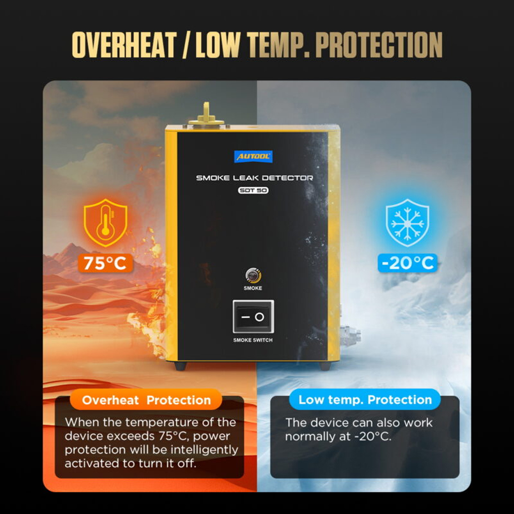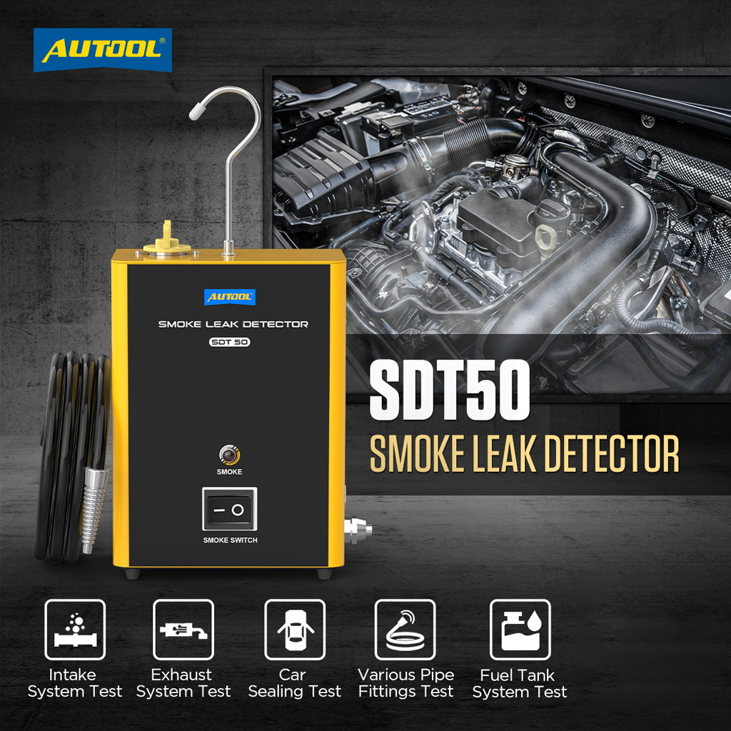- Large gamme d’applications : le détecteur de fuite de fumée AUTOOL SDT50 convient à la détection de fuites dans les automobiles, les motos, les motoneiges, les VTT, les camions légers et les bateaux rapides, adapté à tous les modèles (uniquement pour 12 V CC).