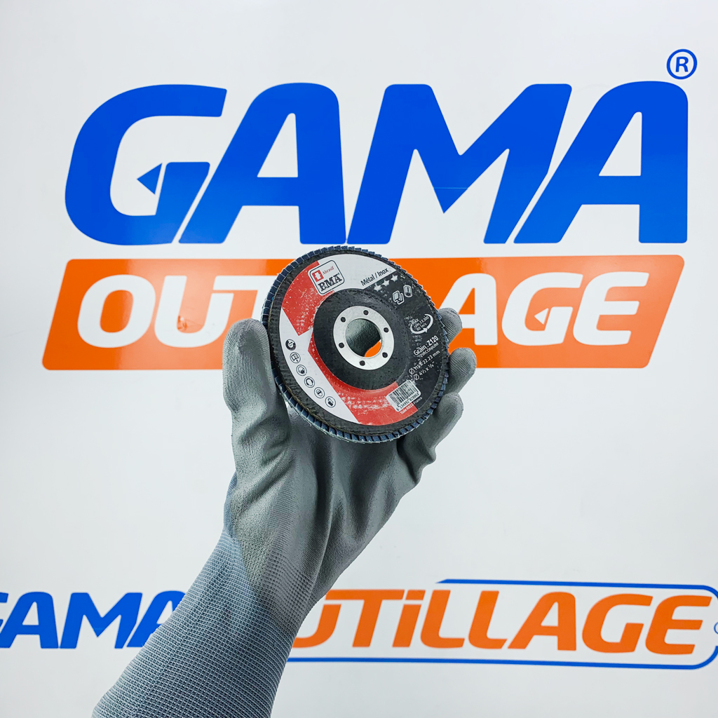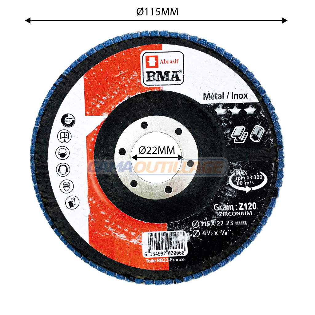 GAMAOUTILLAGE vous propose une DISQUE A LAMELLES Ø115 G 120 INOX BMA, est un disque abrasif utilisé pour le meulage et le polissage de l’acier, et inox. Il est composé d’un support en fibre de verre sur lequel sont fixées des lamelles abrasives. La granularité G120 indique que les lamelles sont relativement grossières, ce qui les rend adaptées au meulage de matériaux durs.