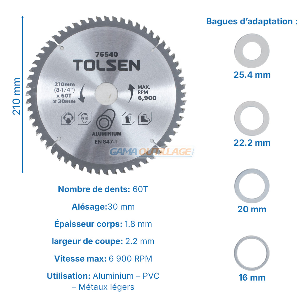 DISQUE CARBURE ALUMINUM Ø210MM 60DENTS TOLSEN
