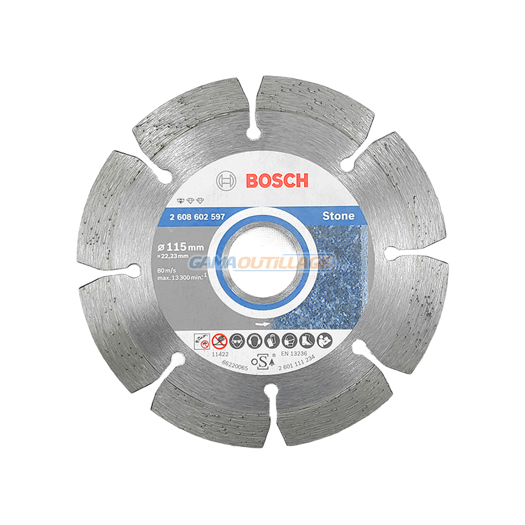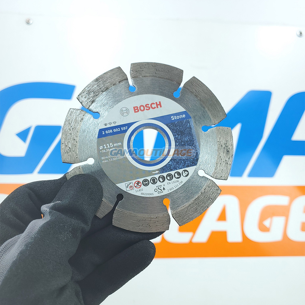 Disque diamant BOSCH 115 mm pour pierre. Pour coupe rapide et précise sur béton et parpaing. Alésage 22,23 mm. Disponible chez GAMA OUTILLAGE.