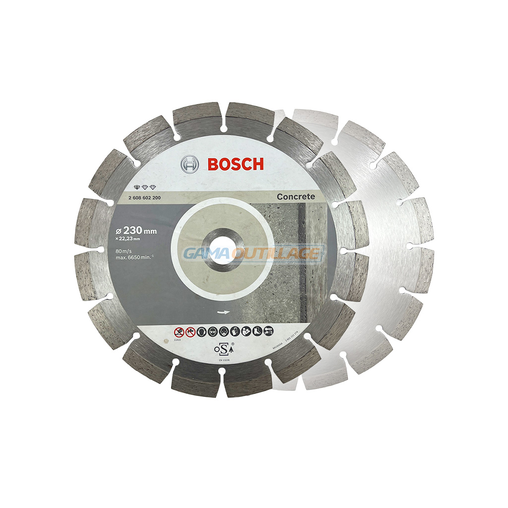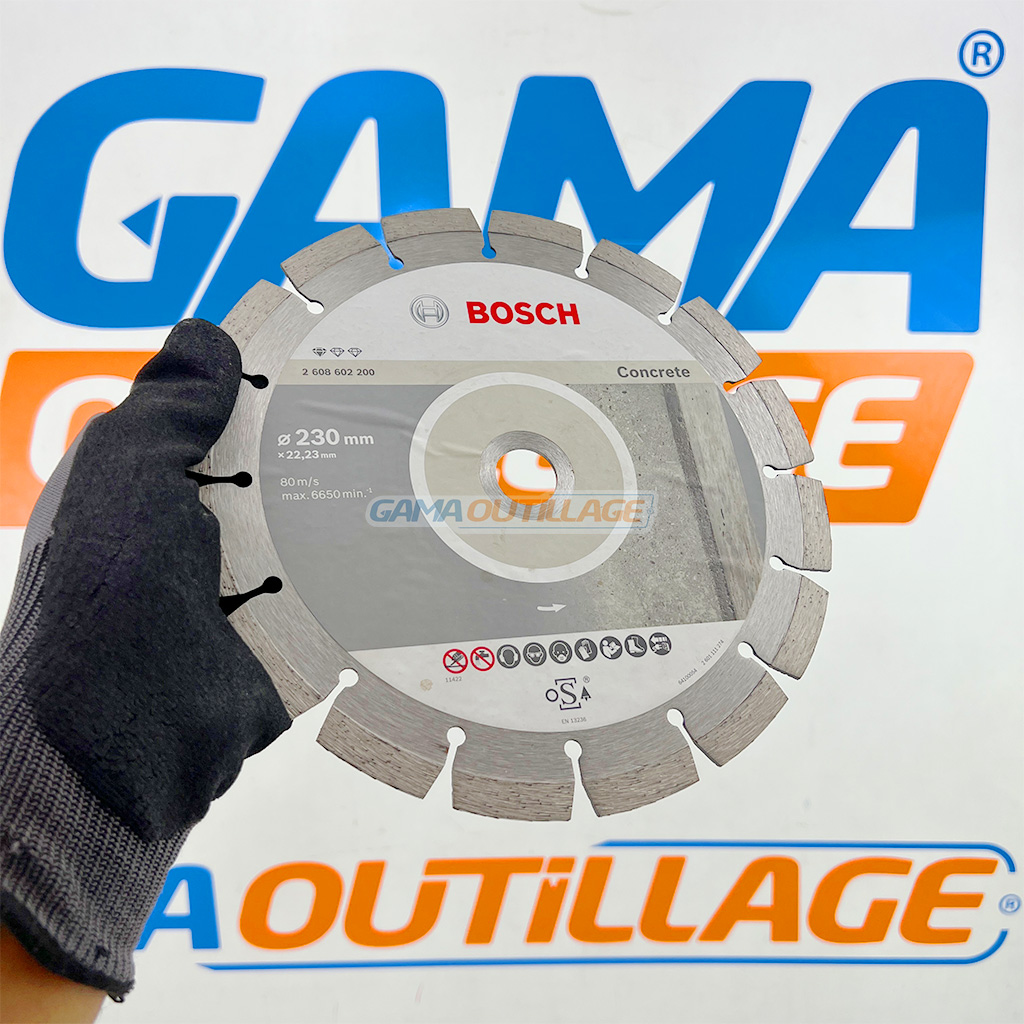 Disque diamant BOSCH Ø230 mm béton. Coupe rapide, segments soudés laser, compatible meuleuses. Qualité pro. Chez GAMA OUTILLAGE.
