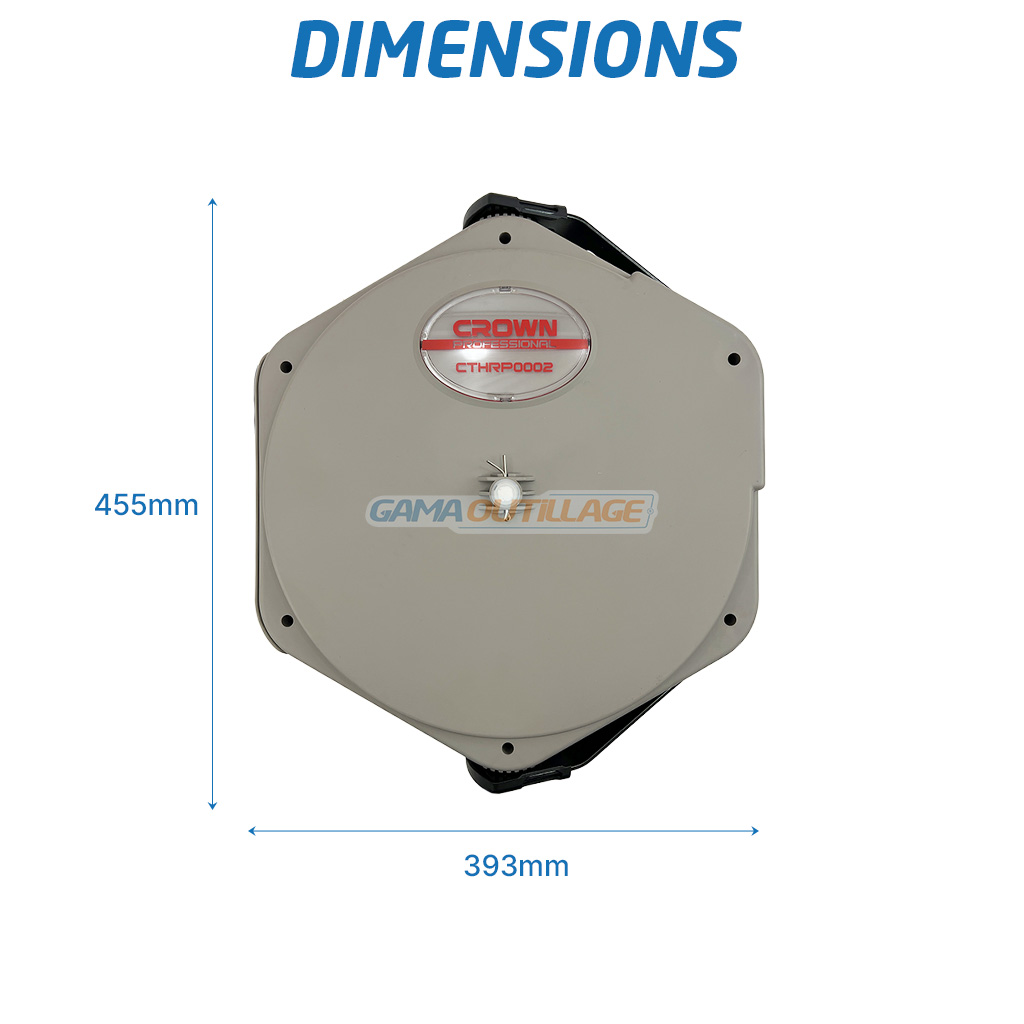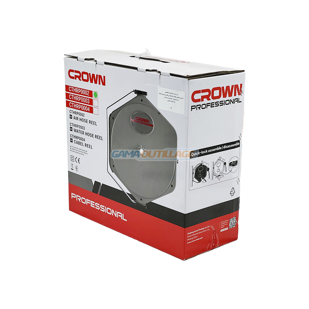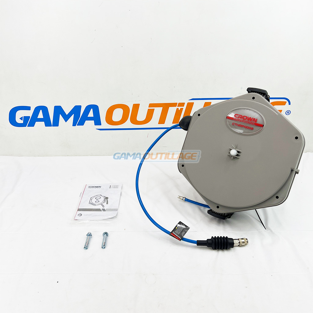 Enrouleur pneumatique automatique CROWN 20m. Tuyau renforcé, support mural 180°, blocage rapide, boîtier ABS robuste. Chez GAMA OUTILLAGE.