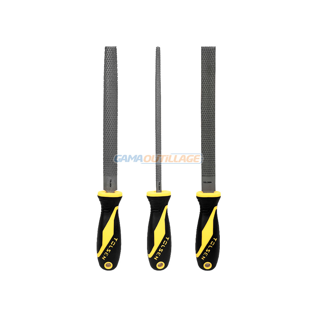 Jeu de râpes à bois TOLSEN 3 pièces. Plat, demi-rond et rond, acier carbone #45, poignées ergonomiques, 315 mm. Chez GAMA OUTILLAGE.