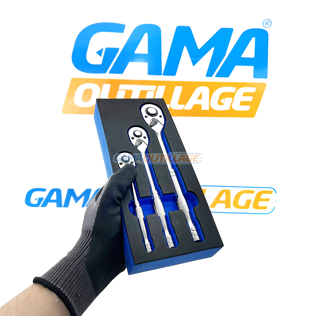 Set 3 cliquets DYNAMO (1/4″, 3/8″, 1/2″) avec libération rapide. Mécanisme réversible. Coffret mousse inclus. Usage pro et atelier.