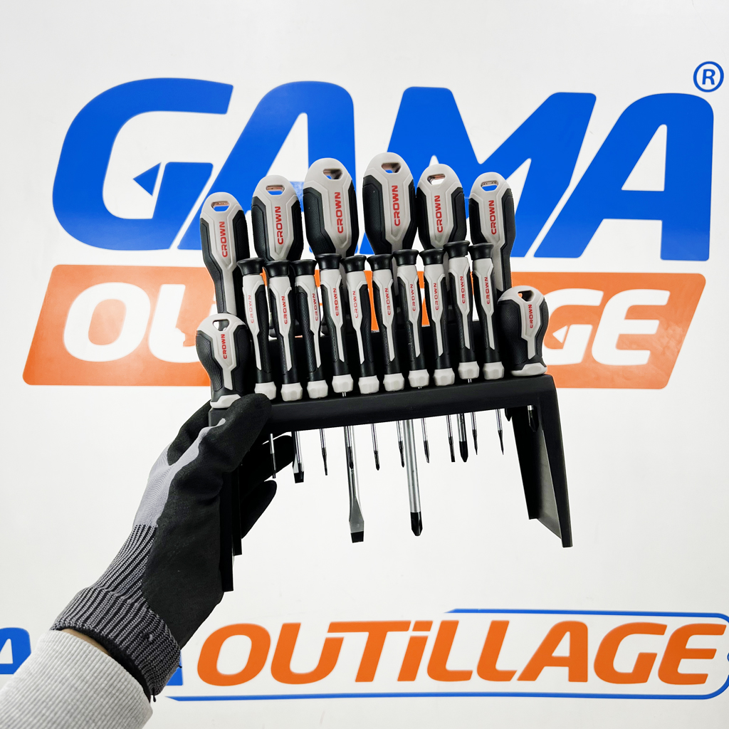 GAMAOUTILLAGE vous propose une JEUX TOURNEVIS 18PCS CROWN, est un ensemble de tournevis complet et polyvalent qui vous permettra de réaliser tous vos travaux de bricolage. Il comprend une variété de tournevis à tête plate et cruciforme.